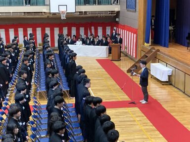 3月13日に本校体育館にて第66回卒業式が行われました。天候にも恵まれ、卒業生全員が担任から呼名を受け、卒業のこの日を迎えることができました。式典では校長からの式辞や来賓祝辞が述べられ、厳粛な中進んでいきました。そして、生徒会長からの送辞のあと、卒業生代表から下級生に向けて心に残る答辞が述べられました。最後に校歌さらに式歌を全員で斉唱し、卒業式を無事終了することができました。