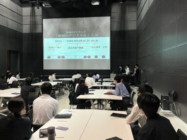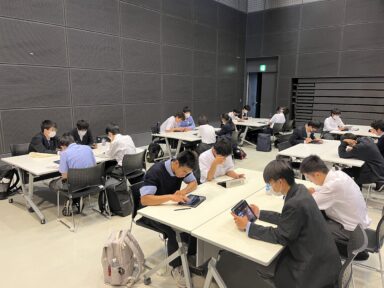 1年生理数科全生徒42名が参加し、12グループに分けて、各グループ異なる展示ブースを調べました。午前の部では、担当ブースにある科学技術の「光」と「影」に着目して、その科学技術への理解を深めました。午後の部では、午前中でまとめたものについて各グループでスライドを作り発表を行いました。