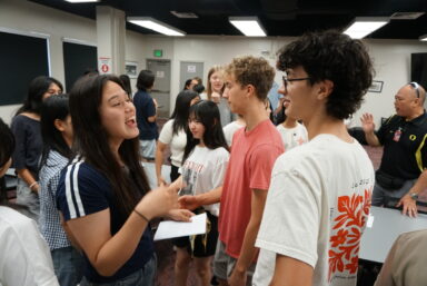 その後、ハワイにおける本校の連携校であるラドフォード高校へ向かいました。向かうバスの中では、ホームステイにおける会話練習ををペアになって行い、準備万全な状態で訪問しました。