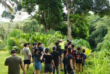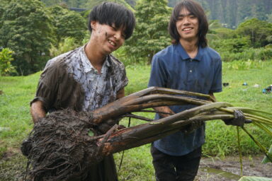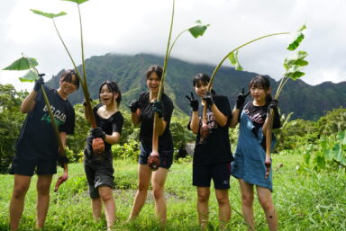 その後、タロ芋畑があるパパハナ・クアロア研修所へ行きました。所員の方から畑の案内、説明を受けました。ハワイの人々にとってタロ芋畑は神聖な場所であることがわかりました。