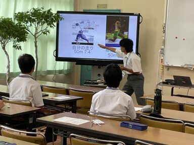 次に、撮影した映像を動作解析アプリ「DARTFISH」に取り込み、関節の角度や動作のタイミングなどのデータを取得。得られたデータをもとに、個人で考察を行い、それをグループで再検討することで、科学的な分析力と協働的な思考力を養いました。午前のまとめとして、各グループの代表者が考察結果を発表し、他者の視点を取り入れた学びの場となりました。