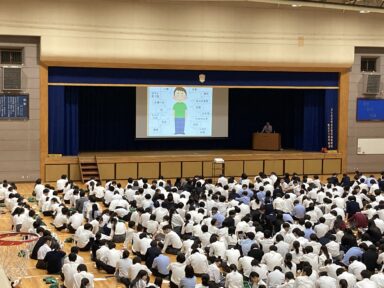 今年度は、埼玉大学ダイバーシティ推進センター准教授の渡辺大輔さんに講師として来ていただき、性の多様性という視点から人権について講演をしていただきました。講演は、単純な文章の並べ替え問題から始まりました。並べ替えると、「父と息子が交通事故に遭い、治療にあたった外科医が『これは私の息子!』と叫ぶ」というストーリーが完成します。ここで渡辺さんは生徒たちに、「人物の関係が分からなくなった人はいないか」と問いかけました。多くの生徒が手を上げる中、渡辺さんはいくつかの考え方の例を紹介してくださいました。「父とは育ての親で、外科医とは生みの親である」「外科医は母親である」「外科医はゲイで、父はそのパートナーである」などなど。外科医が母親という可能性を知らず知らずのうちに排除していたことに気付き、渡辺さんがおっしゃるジェンダーバイアスが自分にあることを思い知りました。