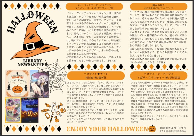 図書館だより10月号のテーマはハロウィンです。ハロウィンに関する本を紹介します。ぜひ読書の秋に1冊読んでみてはどうですか。