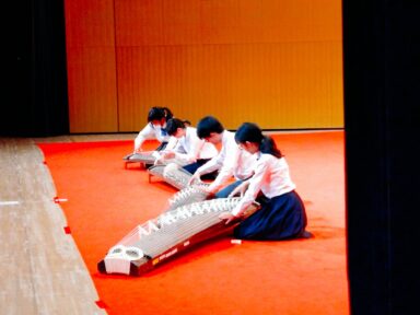 11月5日(水)埼玉会館にて、埼玉県高校総合文化祭・第49回高校邦楽祭が行われ、本校箏曲部は沢井忠夫作曲の「いとたけ」を演奏しました。この曲のタイトル『いとたけ』は曲の内容を表現する為の表題ではなく、いと(箏)と、たけ(尺八)の合奏という意味からきています。一般的に箏がリズムを尺八が旋律を受け持つ傾向がありますが、この曲ではその扱いを双方同じ角度から捕らえられているところが特徴です。今回は尺八パートも箏で演奏しています。1年生4人、各パートを1人で担当し合奏練習を重ねてきました。