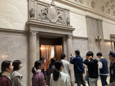 図書委員会主催の文学散歩に参加させていただきました。今年度見学させていただいたのは、国立国会図書館と国会議事堂です。どちらも 1900 年代に設立された建物だったため、瓦を模った部分など日本の伝統的な建築を思わせる部分と、石づくりの西洋風の建築を模している部分が合わさっていました。特に驚いたのは、国会議事堂の建設に使われた石は国内の様々な地域のものということです。沖縄の石を用いた箇所では、珊瑚や魚の化石が見られることに驚きました。