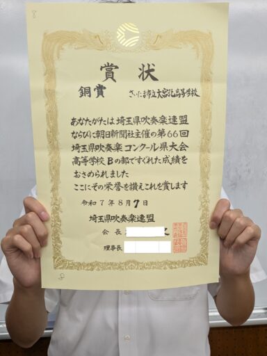7 月 30 日に所沢市民文化センターミューズホールにて行われた埼玉県吹奏楽コンクール地区大会高校 B の部で金賞を受賞し、県大会への推薦を頂くことができました。また、8 月 7 日にさいたま市文化センターで行われた第 66 回埼玉県吹奏楽コンクール県大会高等学校 B の部に出場し、銅賞を受賞しました。惜しくも目標には届きませんでしたが、大きな成長を感じられる夏となりました。