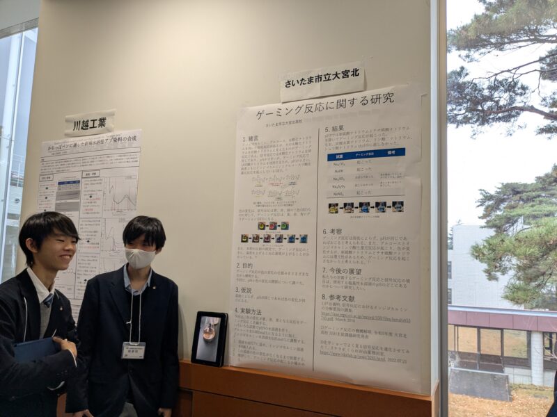 本校サイエンス部所属の3チームがポスター発表を行いましたが、多くの見学者に恵まれ、多角的な視点から研究成果のご講評を頂戴することができました。見学者の方には、研究方針のアイデア出しやデータ分析の方法、ポスター発表のコツまで、アドバイスを丁寧にしていただき、特に1年生の部員にとっては大変ありがたい機会となりました。また、他校の生徒との交流は、研究意欲を高めるよい刺激となりました。