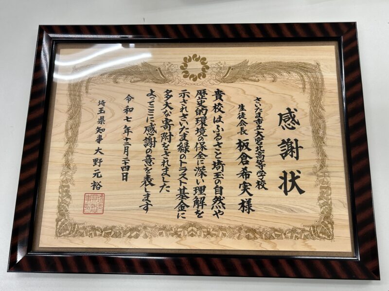 今回の感謝状は今年度の文化祭等の学校活動で出た収益を「さいたま緑のトラスト基金」に寄附したため贈呈されたものです。本校はユネスコスクールとしての取り組みも行っています。今回は主に森林保全に活用される予定の基金への寄附をさせていただきました。