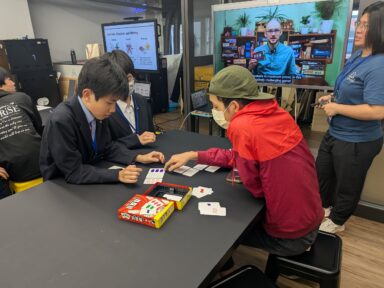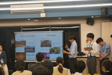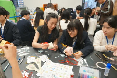 セレモニー後は文化、数学、音楽、地学、情報のグループに別れて授業を体験しました。文化では、ランタンを作り願いを書きながらお互い話を深めていました。数学は様々なカードの中から規則性を見つけ取っていくカードゲームを通して意見交換をしました。情報では先生手作りのじゃんけんアプリを通しての交流、音楽ではグループに与えられた物を使いながら楽曲制作、地学は望遠鏡制作と、どのグループも協働的で深い学びをすることができました。