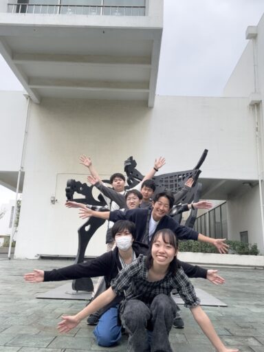 美術館では近代アートを学びました。段ボールで作られた原寸大のプロペラ飛行機に圧倒されたので負けじと自分たちを材料に現代アートを完成させてきました。