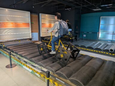 博物館では体験型のブースが多く、アームロボットの操作や地形に対しての効率のよい車輪の形をした自転車の運転など先端技術を学ぶ事ができました。