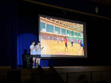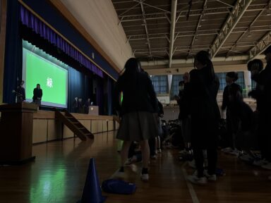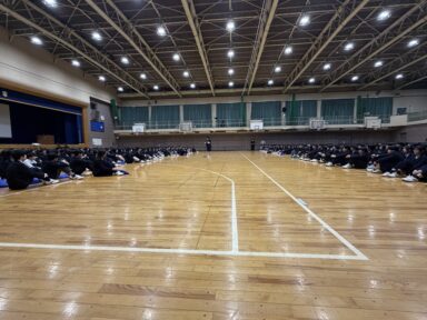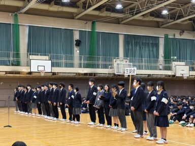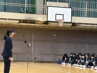 1年生と2・3年生の初対面です。生徒会役員が挨拶をし、新入生代表の生徒が2・3年生に今の気持ちや意気込みをお話ししてくれました。