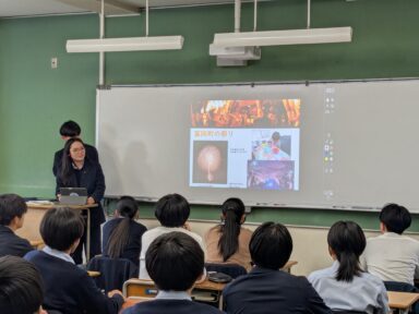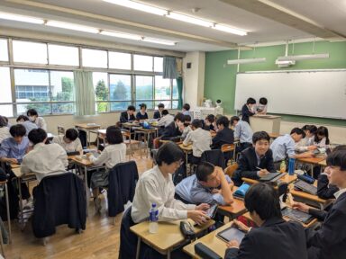 2年生の総合的な探究の時間では、「Hamadoori Reborn」という、2011年に発生した東日本大震災で多大な被害を受けた福島県浜通り地区の復興を促進し、地域の人々と高校生が連携しながら「持続可能な町おこし」を実現しようとするプロジェクトに取り組んでいます。このプロジェクトは4年目を迎え、今年は文化祭での観光PRのほか、これまでの活動成果のまとめに取り組む予定です。